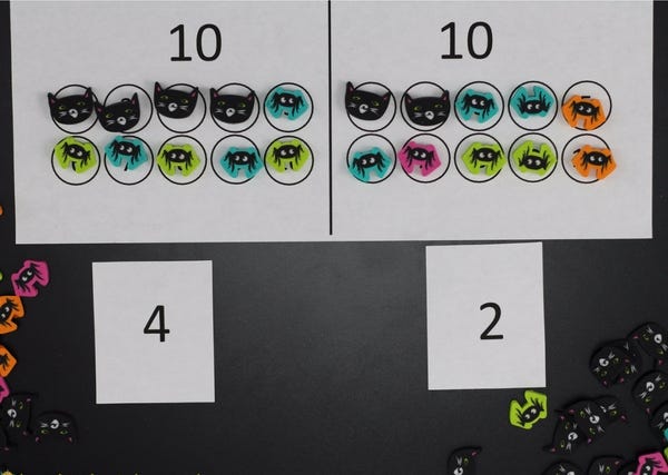 Many teachers find it fun and beneficial to incorporate the Halloween theme into classroom activities. For example, an elementary teacher for Simpson County Schools in Franklin, Kentucky, fills a plastic pumpkin with Consonant-Vowel-Consonant (CVC) words as well as some festive plastic spiders. The students take turns pulling the CVC words out of the pumpkin, and they work together to pair the words. Another classroom activity this teacher found successful was using Halloween-themed erasers for their “ten-frame” mats. The goal is that students will learn about the different ways they can build the number ten. One way to accomplish this is by making groups based on the kinds of erasers they have in their set of ten. For example, four black cats and six spiders.
